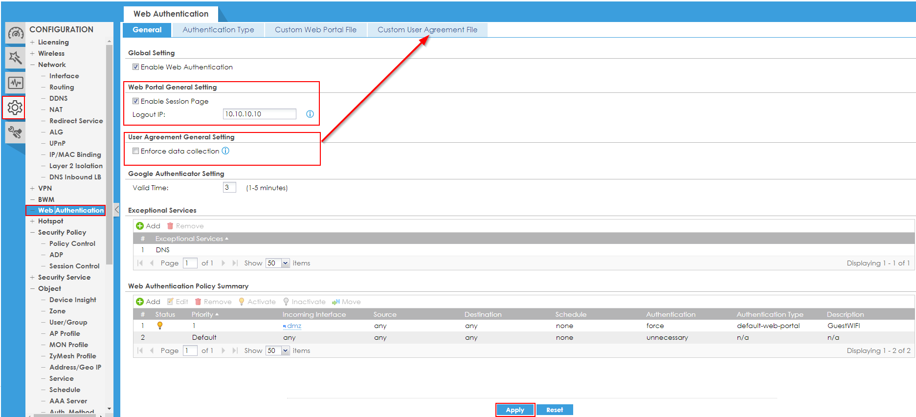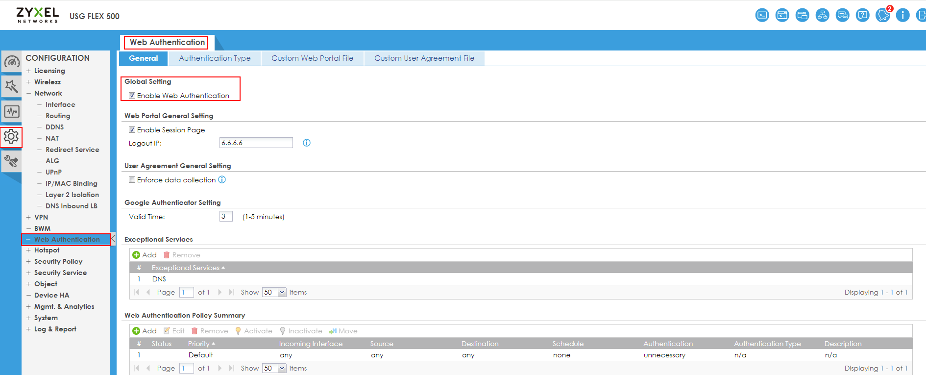 Configuration > Web Authentication > Enable Web Authentication