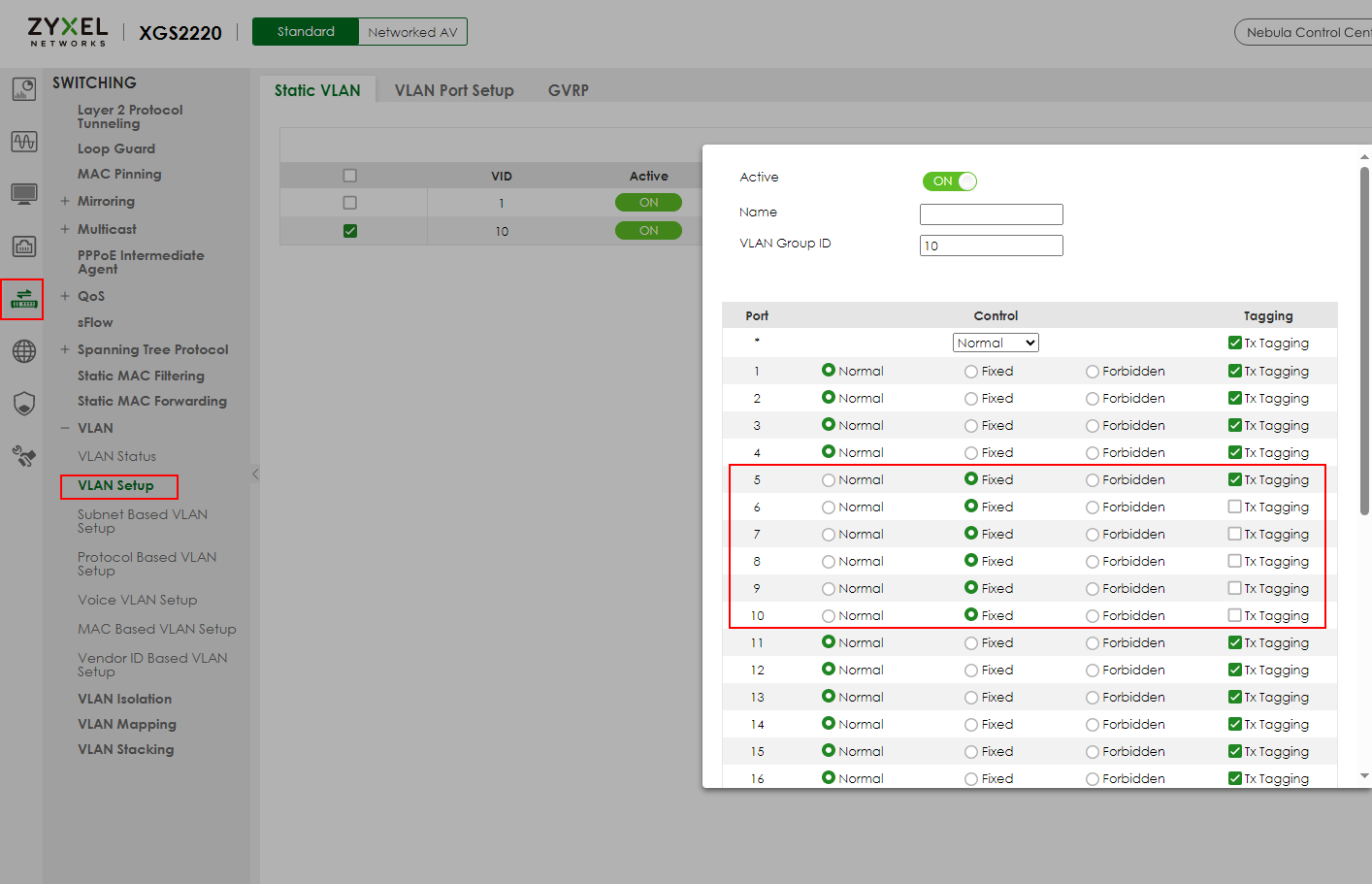 Add the required VLANs, in our case it is VLAN10. For ports 5 through 10 inclusive. Port 5 will be tagged, our firewall will be connected to this port. Port 6 through 10 will be untagged, access points and PCs will be connected to it.