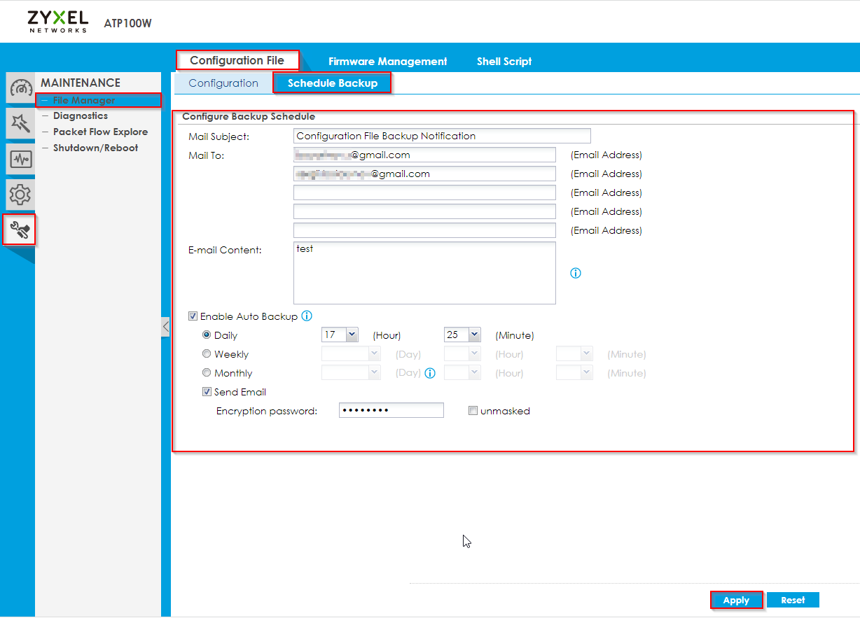 Use the Schedule automatically back up the current Zyxel Device configuration file according to a schedule, and then send it to the configured email addresses.