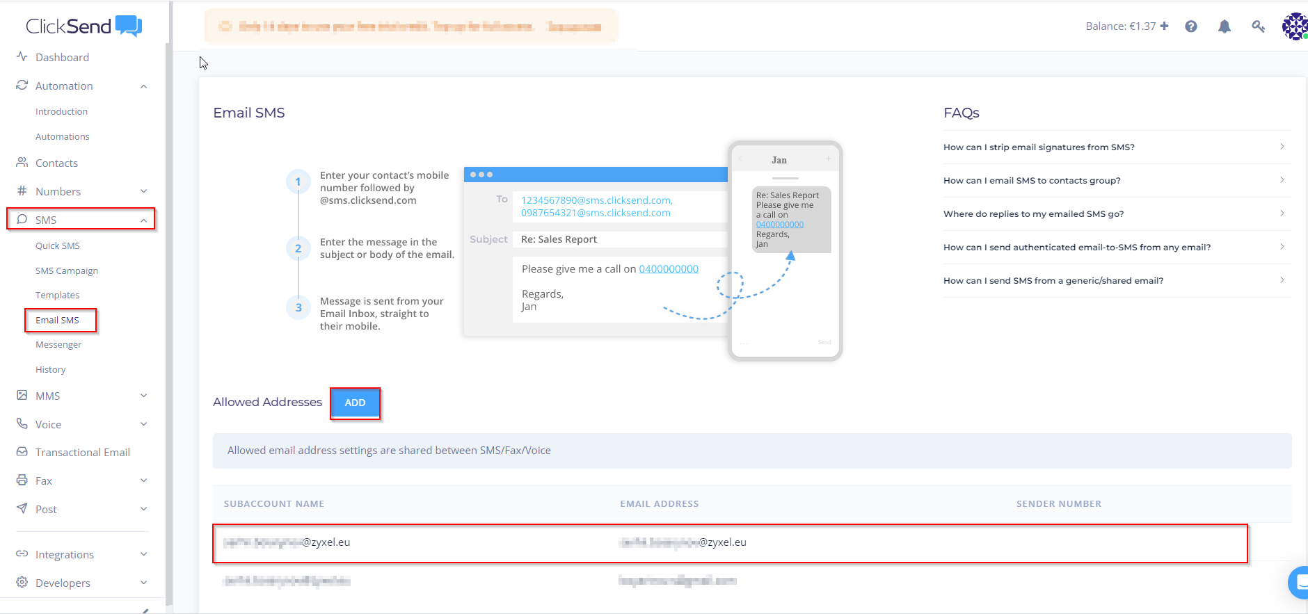 Go to SMS > Email SMS. Enter the Email address which sends mail to SMSGlobal.