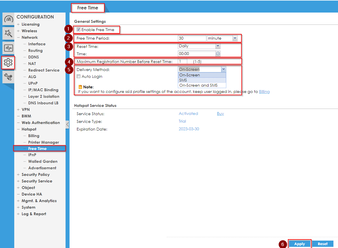 You may want to be able to provide your users with free access to Internet service for a certain period of time. Use Hotspot Free Time Feature to enable and configure the free time internet settings.