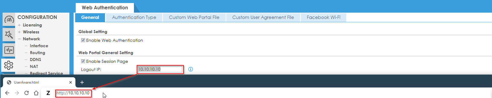 2. Select the "Enable Session Page" check box to turn on the feature and specify an IP address that users can use to terminate their sessions manually by entering the IP address in the web browser's address bar.