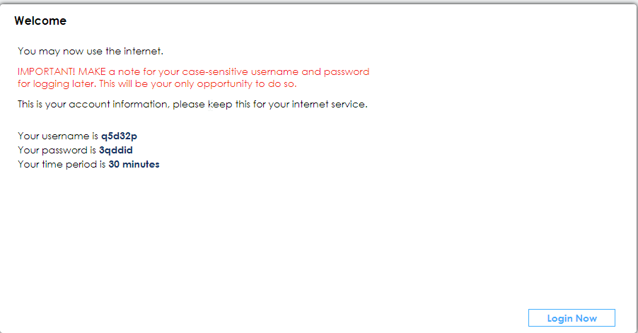 In the next window, you will see the username and password that you can use to access the Internet according to the plan. Make a note of your username and password so that you can use them whenever you need to access the Internet. If you want to use the free access immediately, click "Login now".