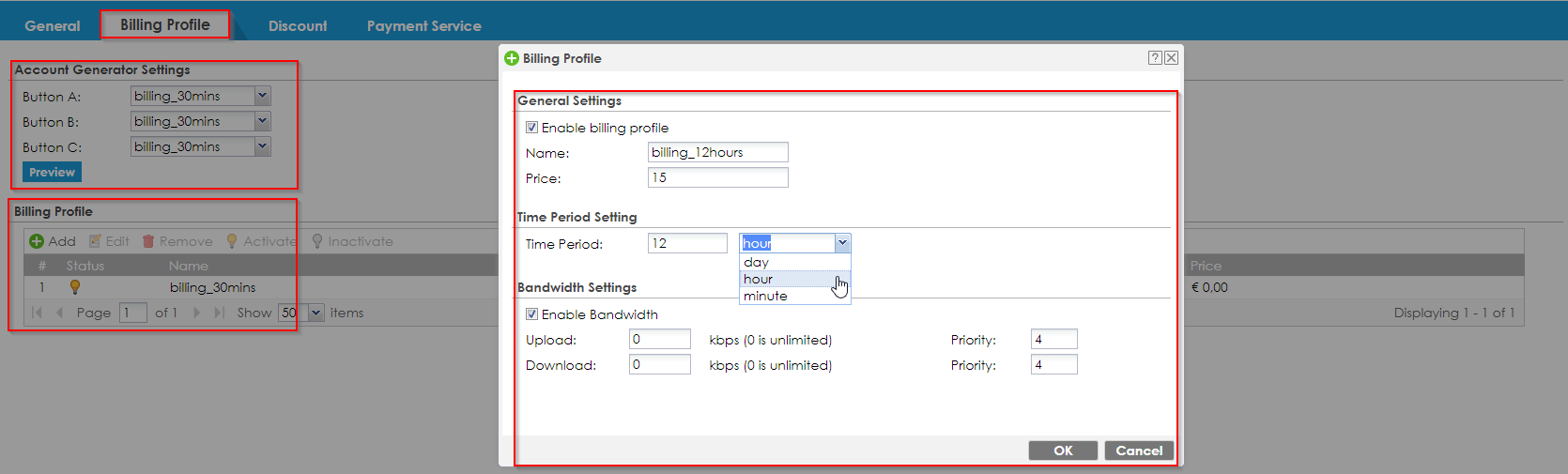 Go to Configuration > Hotspot > Billing > Billing Profile to open the following screen.