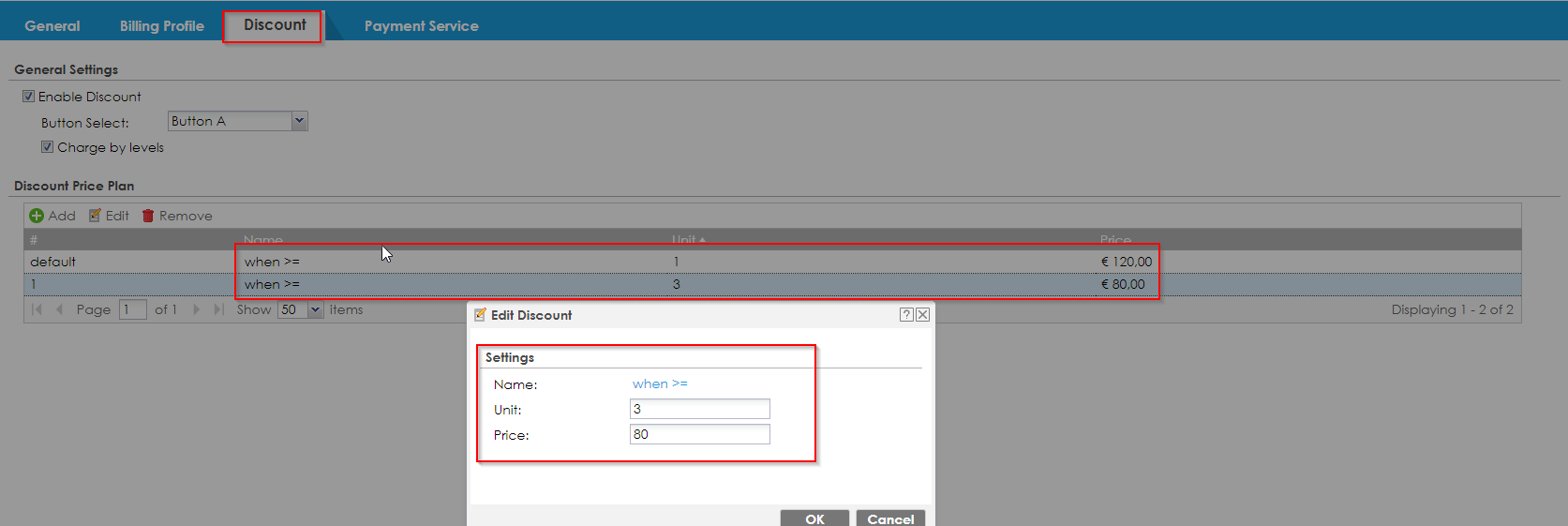 Go to Configuration > Hotspot > Billing > Discount, and then Add or Edit icon to open this screen.