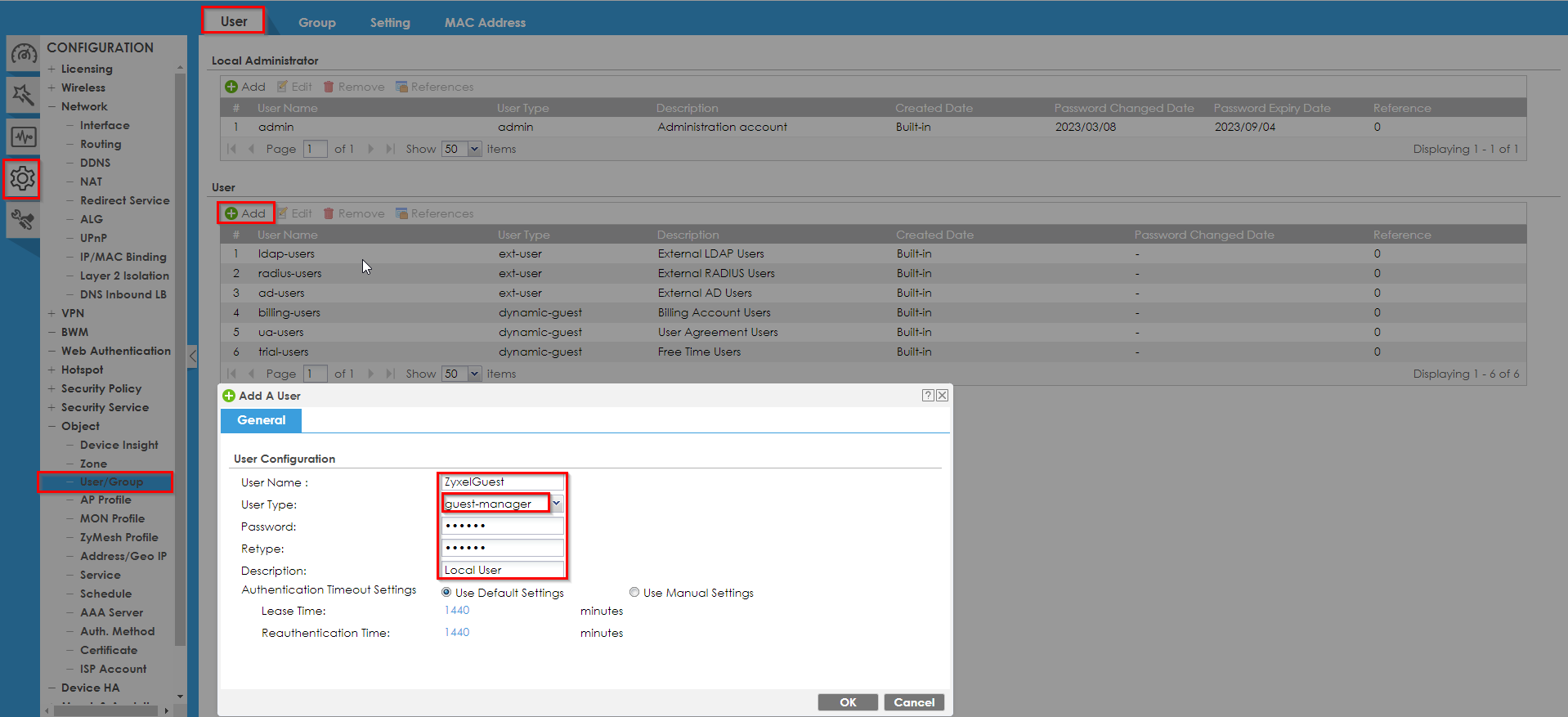 1. First, create a user with the user type "guest-manager". We will use this user to manage and generate access to the Internet.