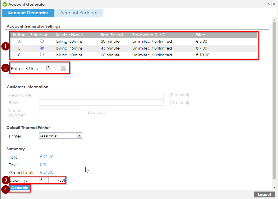 3. As soon as you connect using guest-manager, you will immediately be taken to the "Account generation" page, where you can find the setting page where you can define the profile on the printer and select the desired quantity.
