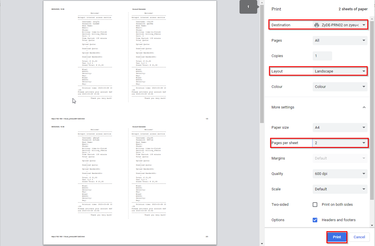 This article will show how to create a guest-manager account and how to configure the possibility for that user to print access to Guest WiFi. You can use your own printer and generate a, for example, 1 hour or 1 week WiFi ticket/bill to the guests using the WiFi.