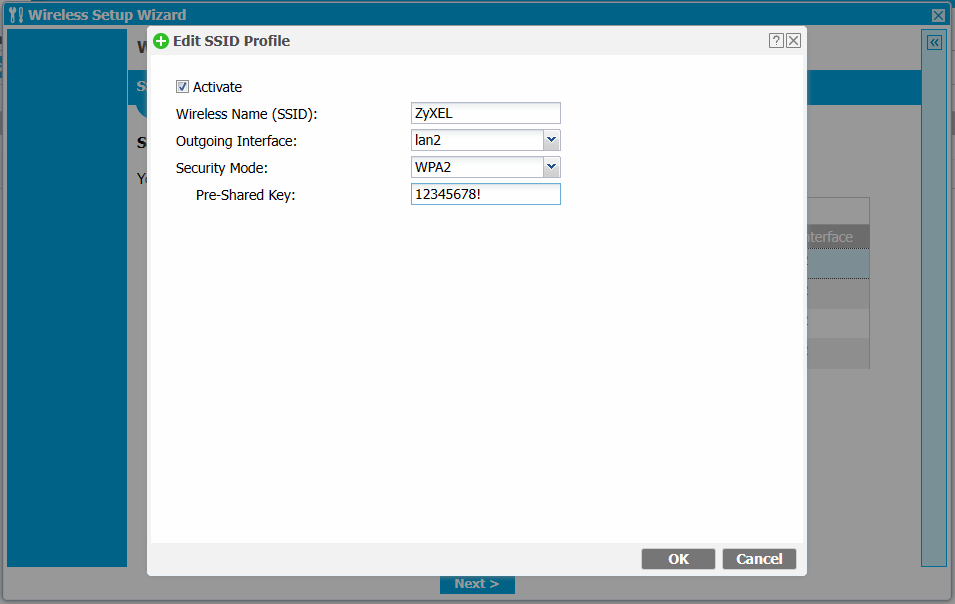Double-click on the ZyXEL SSID and change the Security mode from Open to WPA2 in order to secure your SSID and network:
