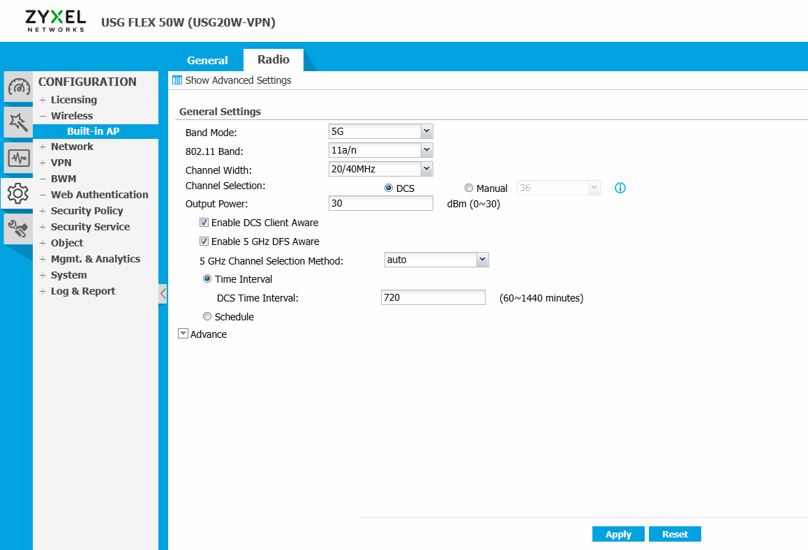 Go to Configuration -> Wireless -> Built-in AP -> Radio -> General Settings