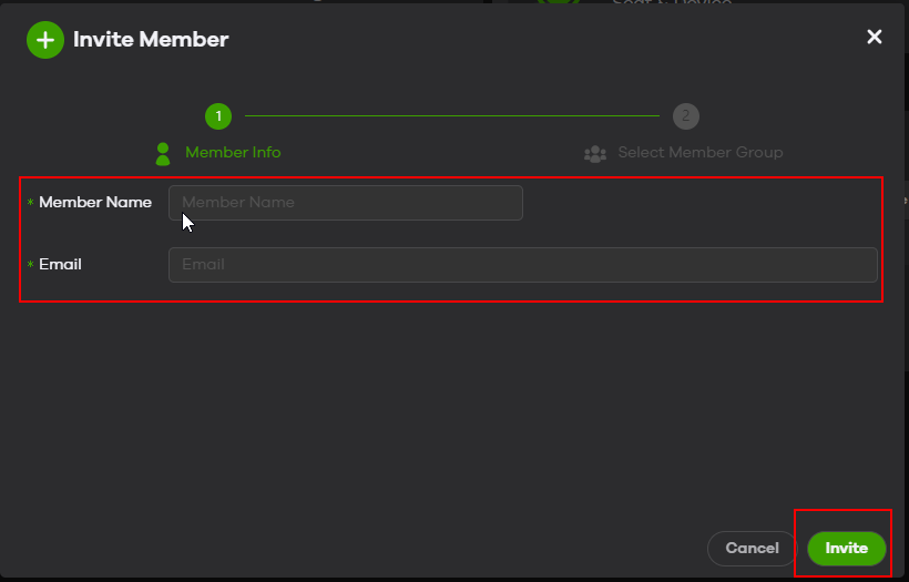 - Fill in the required fields, namely username and e-mail address, and click "Invite"