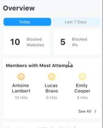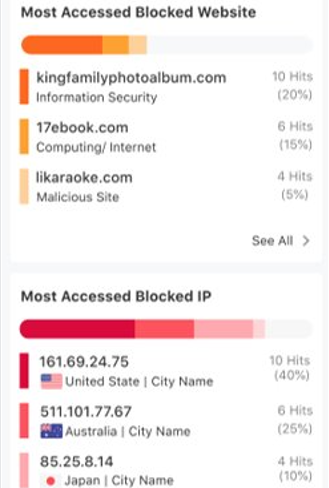 Here you'll see the alerts and information regarding the blocked websites and IPs. You'll see how many websites and IPs and number of attempts. This can be communicated throughout the organization to inform the risky users as well as prove the value that Astra App brings.