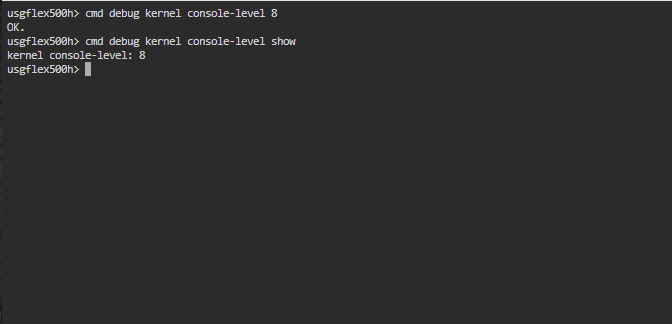 Check the debug level. usgflex500h> cmd debug kernel console-level show kernel console-level: 8 |