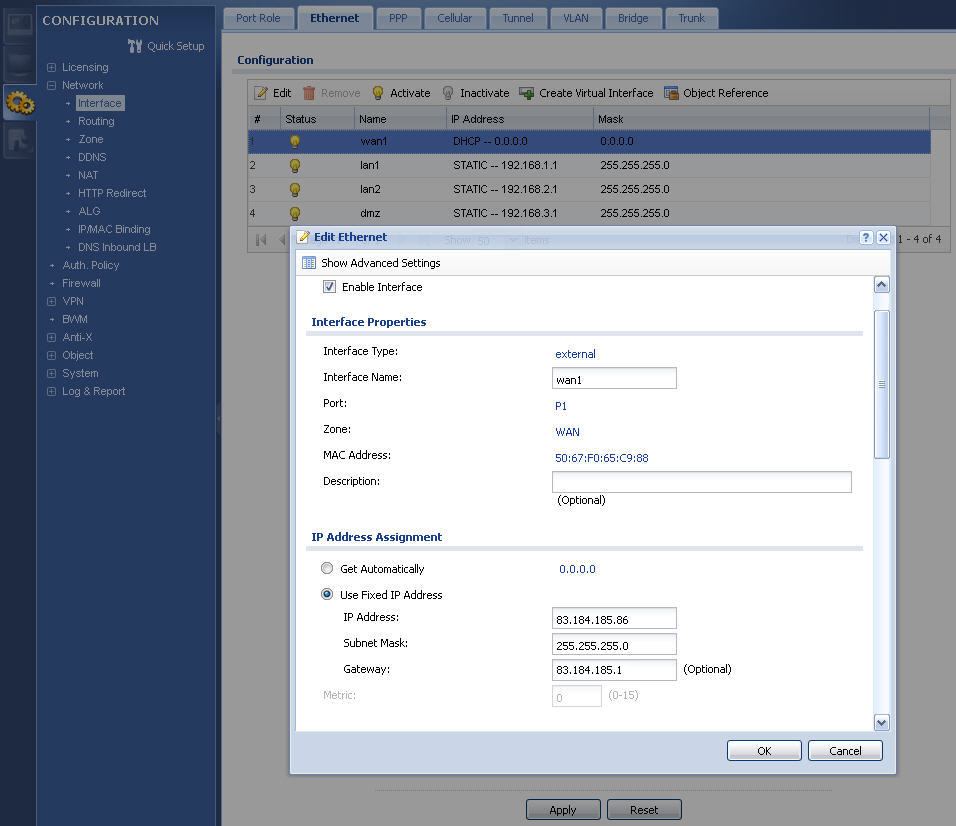 1. Go to Configuration> Network> Interface> Ethernet to configure a static IP address on the device's WAN interface (click on the WAN interface configuration entry and then click Edit ).