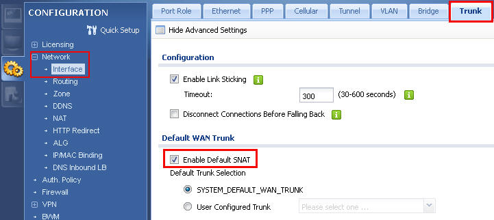 Make sure that the Enable Default SNAT option is enabled in the Configuration> Network> Interface> Trunk menu (to provide users of the local network with internal IP addresses from accessing the Internet). To display this option in the upper left corner, click Show Advanced Settings . By default, the Enable Default SNAT parameter is enabled.