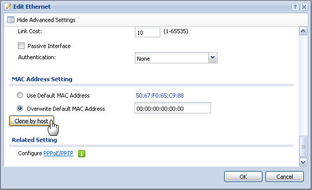 - In the MAC Address Setting section that appears, set the value to Overwrite Default MAC Address and then click the Clone by host button.
