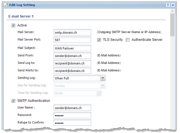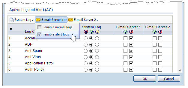 To send e-mails via Configuration> Log & Report> Log Settings> E-mail Server 1> Edit the e-mail profile 1. Under Active Log and Alert, enable enable alert logs for e-mail server 1 the immediate dispatch of alarm messages.