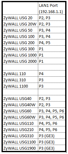 In the following table you can see which is the LAN1 port (192.168.1.1) on the ZyWALL Series in default settings: