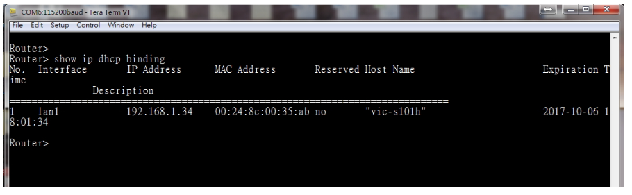 3. Enter "Show ip dhcp binding" to list DCHP client.