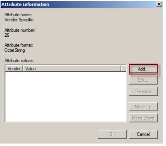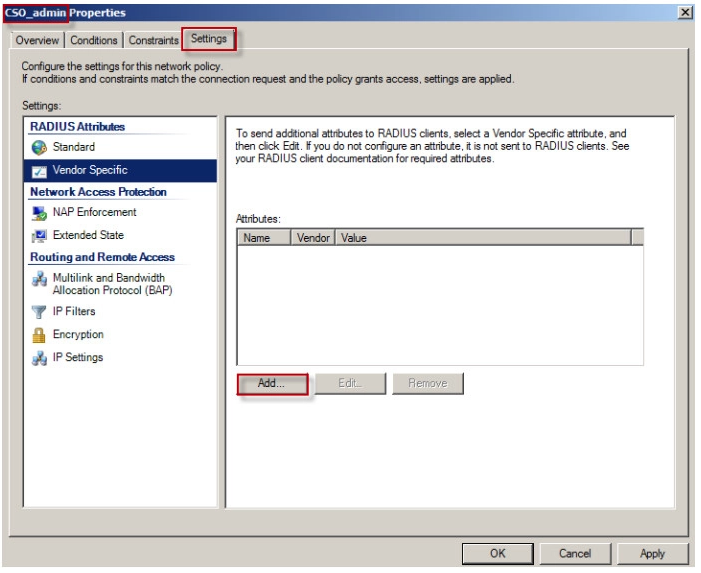 3. Go to Settings > RADIUS Attributes > Vendor Specific. Click on the Add button.