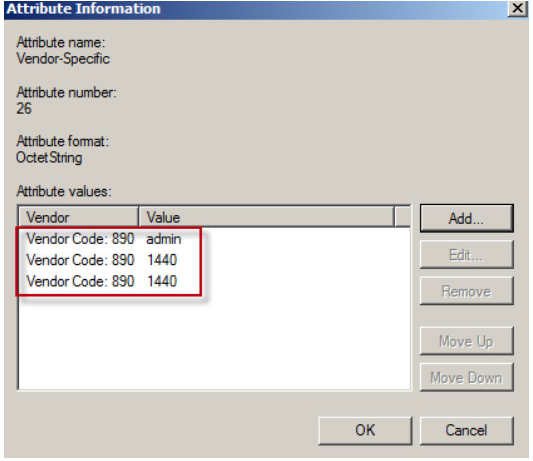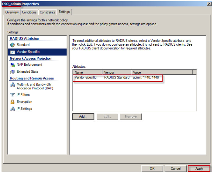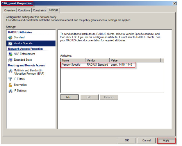 10. Repeat steps 1 to 9 to complete the vendor-specific attribute configuration for Network Policy CSO_guest and CSO_support.