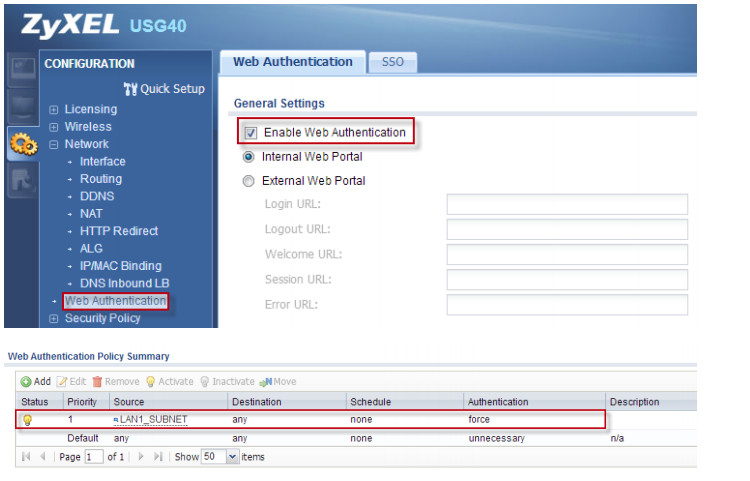 1. Place a check in the Enable Web Authentication checkbox on the USG.
