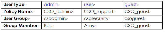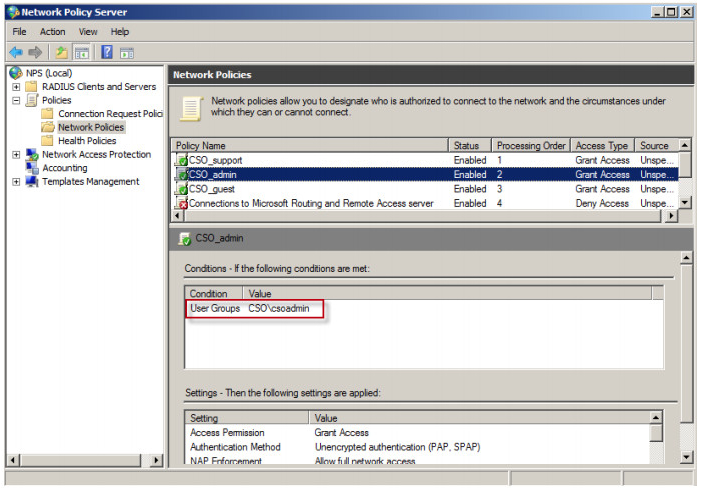 Create three groups on the RADIUS server: csoadmin, csosecurity and csoguest. Add members in each group.