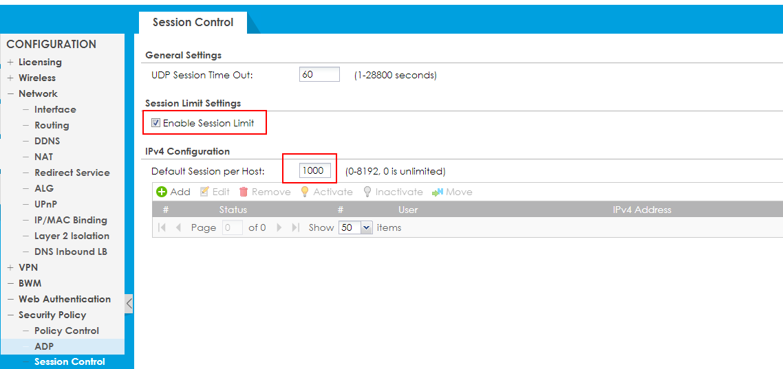 Step 3: Navigate to "Configuration -> Security Policy -> Session Control" and then enable session limit (on by default). The default sessions per host is 1000 and 0 is unlimited: