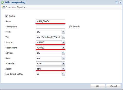 As an example: To block the traffic between VLAN10 and VLAN20 set the source to the created VLAN10 and the destination to VLAN 20. The action of the rule is “deny”.