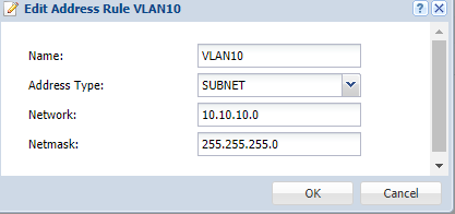 Go to Configuration > Object > Address/Geo IP > Address. Now create for every VLAN an object. Click Add and give the rule a name (in this example VLAN10). Set Address Type to SUBNET and type in the VLANs IP address and mask. Repeat this step for ALL your VLANs.