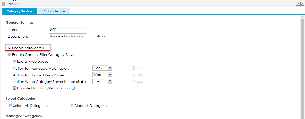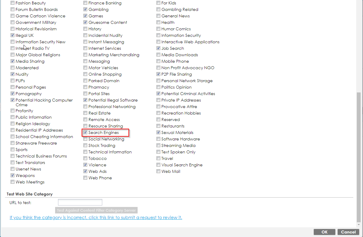 - Enable "SafeSearch" and check the box next to "Search Engine". This will block all search engines except those you added to trusted web sites in the previous step.