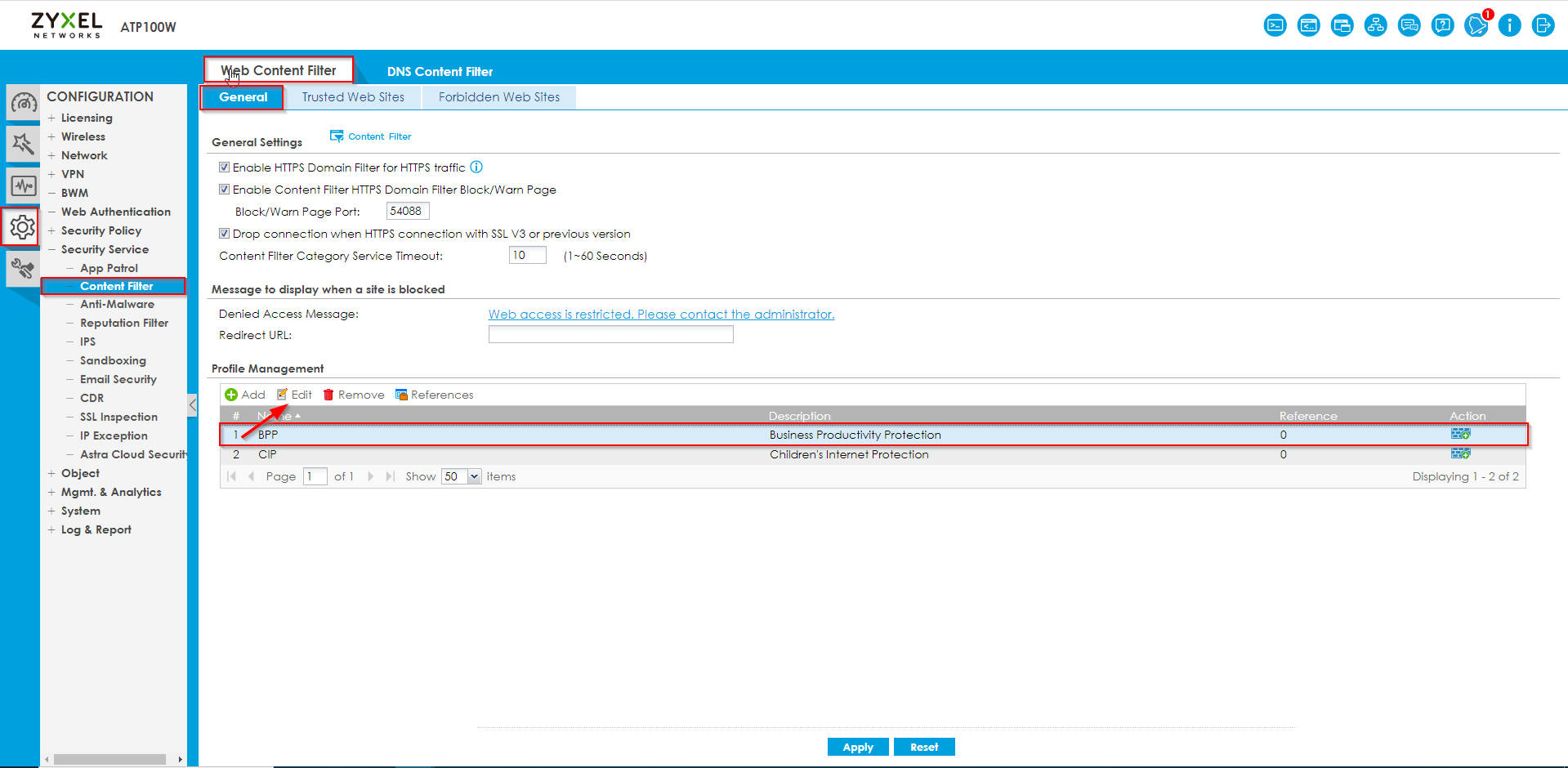 Configuration> Security Service> Content Filter> Content Filter Profile