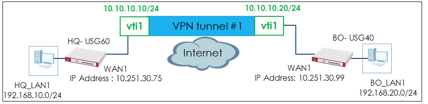 This article shows how to configure an IPSec site-to-site VPN (with USG series) using VTI (Virtual Tunnel Interface). The following instructs how to configure the VPN tunnel between each site. When the VPN tunnel is configured, each site can be accessed securely
