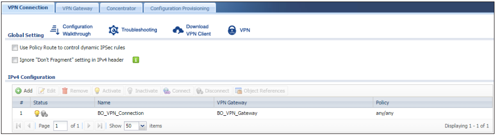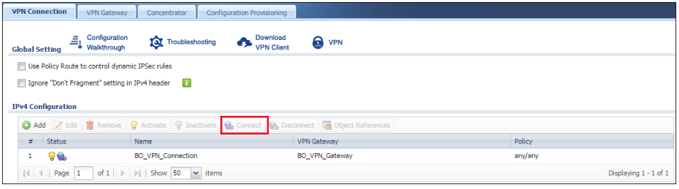 Go back to CONFIGURATION > VPN > IPSec VPN >VPN connection and click Connect.