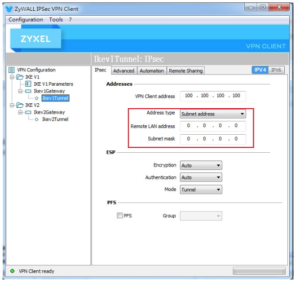 In the VPN gateway (phase 2) settings, enter 0.0.0.0 as IP Subnet for the Remote LAN address and subnetmask.
