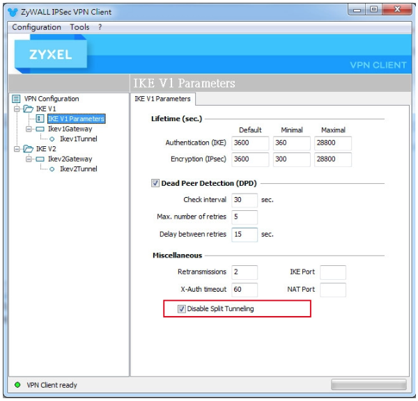 VPN connection > IKEv1 parameters and enable the Disable split tunneling option.
