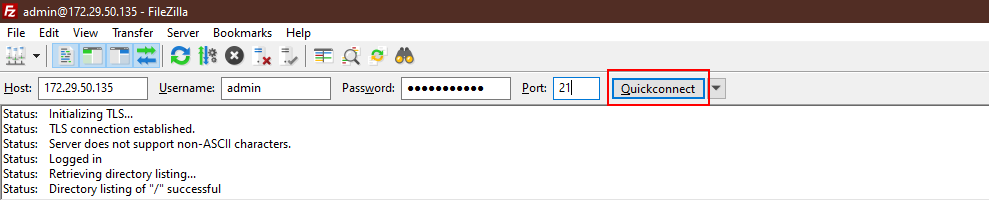 - Enter your host (LAN or WAN Gateway IP), admin username and password as well as port 21 (FTP port) and click Quick Connect