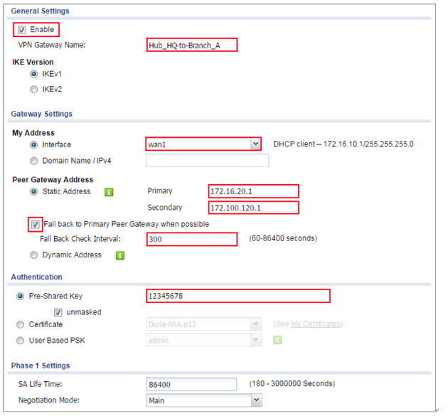 Configure the Primary Gateway IP as the Branch A’s wan1 IP address (in the example, 172.16.20.1) and Secondary Gateway IP as the Branch A’s wan2 IP address (in the example, 172.100.120.1).
