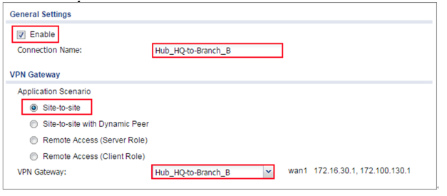2 Go to CONFIGURATION > VPN > IPSec VPN > VPN Connection and select Enable. Type the Connection Name used to identify this VPN connection. Select scenario as Site-to-site and VPN Gateway which is configured in Step 1.