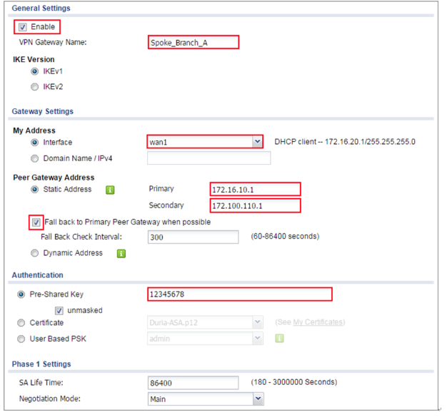 Then, configure the Primary Gateway IP as the Hub_HQ’s wan1 IP address (in the example, 172.16.10.1) and Secondary Gateway IP as the Hub_HQ’s wan2 IP address (in the example, 172.100.110.1). Select Fall back to Primary Peer Gateway when possible and set desired Fall Back Check Interval time.