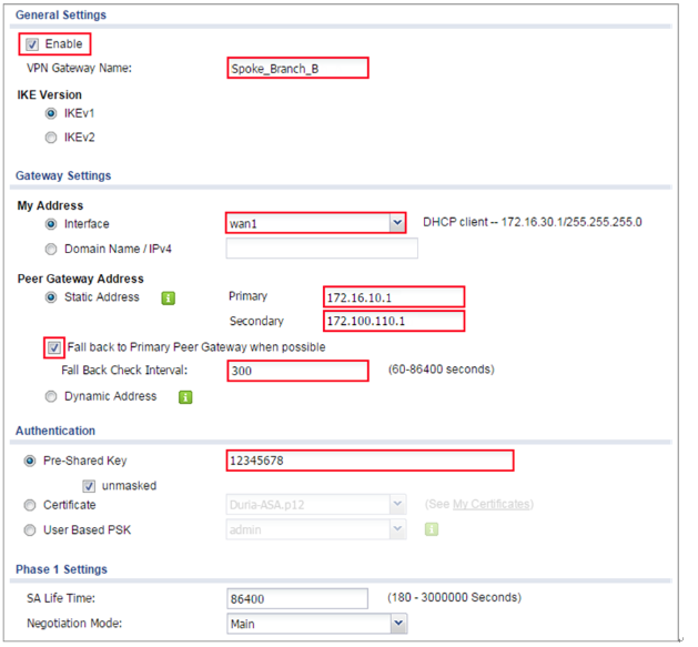 Then, configure the Primary Gateway IP as the Branch B’s wan1 IP address (in the example, 172.16.30.1) and Secondary Gateway IP as the Branch B’s wan2IP address (in the example, 172.100.130.1).