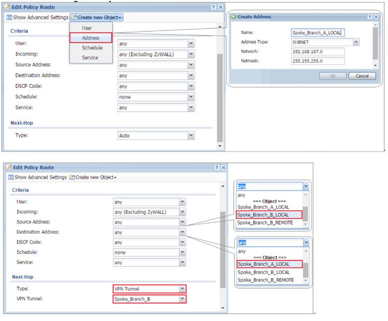 Click Create new Object and set the address to be the local network behind the Spoke_Branch_B. Select Source Address to be the local network behind the Spoke_Branch_A. Then, scroll down the Destination Address list to choose the newly created Spoke_Branch_B_LOCAL address. Click OK.