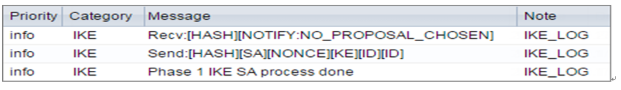 2 If you see that Phase 1 IKE SA process done but still get [info] log message as below, please check ZyWALL/USG Phase 2 Settings. All ZyWALL/USG units must use the same Protocol, Encapsulation, Encryption, Authentication method and PFS to establish the IKE SA.