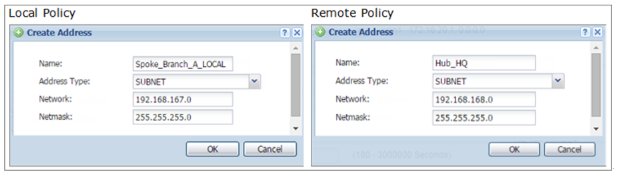 Click Create new Object to add the address of local network behind Hub_HQ and an address of local network behind Branch A.