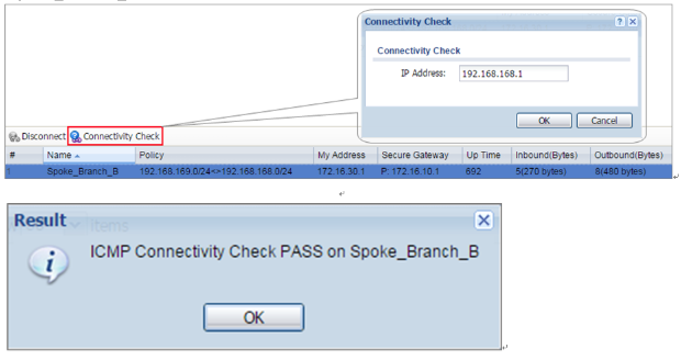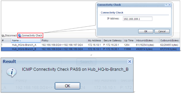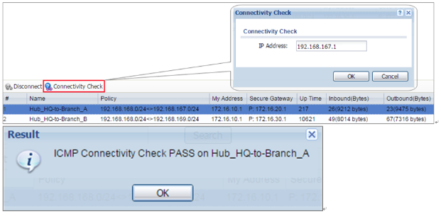 2 Go to ZyWALL/USG MONITOR > VPN Monitor > IPSec and verify the tunnel Up Time and the Inbound(Bytes)/Outbound(Bytes) traffic. Click Connectivity Check to verify the result of ICMP Connectivity.