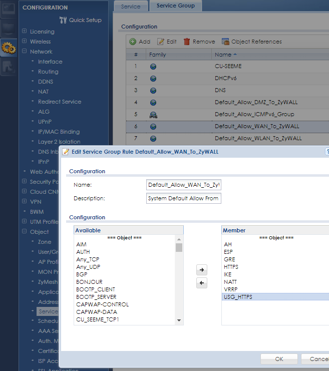 Now go to Service Group and choose the Default_Allow_WAN_To_ZyWALL service group and add the new service. According to the default firewall rules, the USG is defined to allow the services defined in this group from WAN to the device. Note that this will only work if you have not changed the default firewall rules!