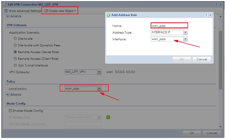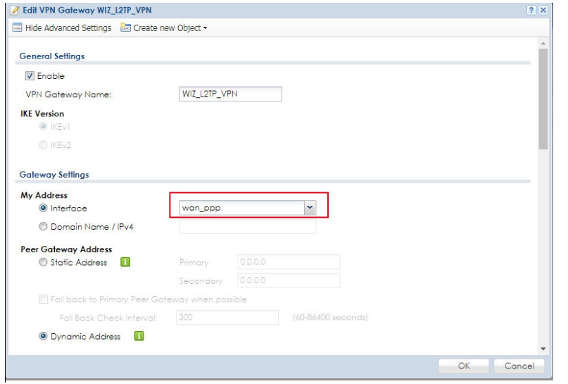 - If you are using PPPoE connection, than make sure to configure the same: "Configuration > VPN > IPSec VPN > VPN Gateway > WIZ_L2TP_VPN" where My address should be selected as “wan_ppp” in Interface - see the snap below;