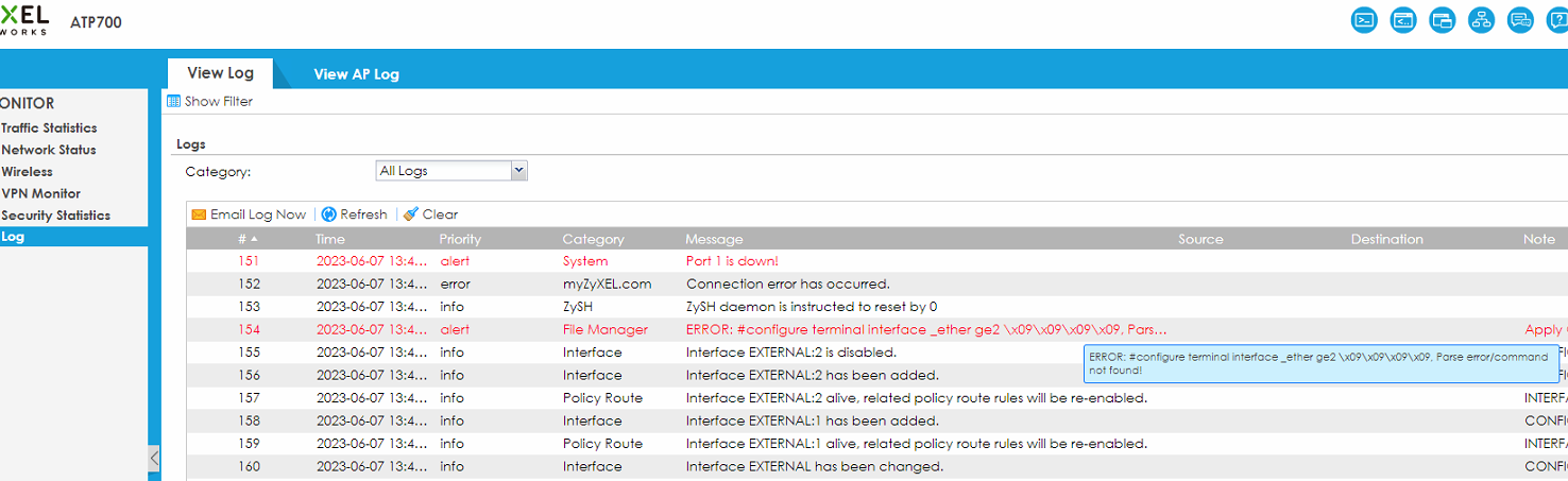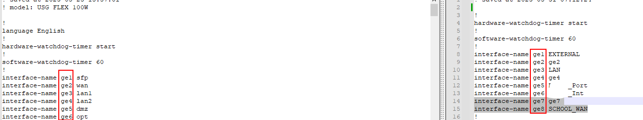 So because the USG FLEX 100 has 6 ports, and the Zywall310 has 8 ports. We need to delete ge7 and ge8 as well as all the references to ge7 and ge 8 by searching in the config file for "ge7" and then "ge8"