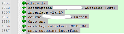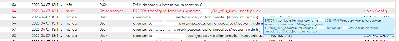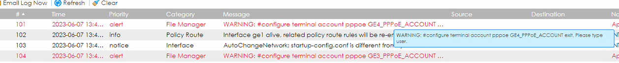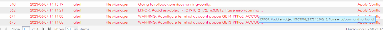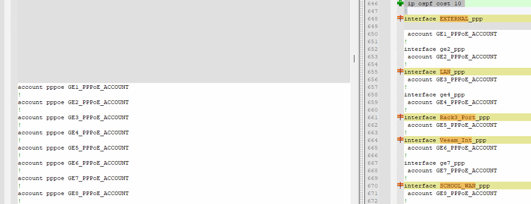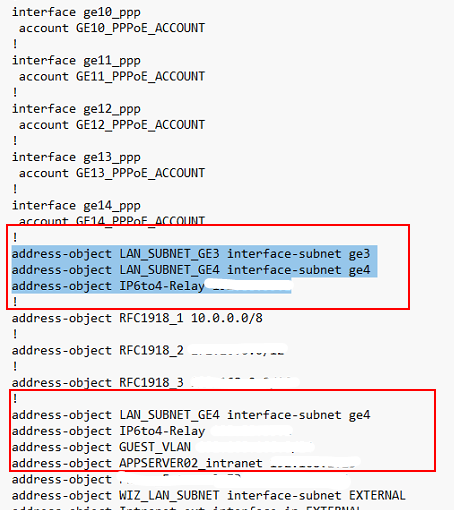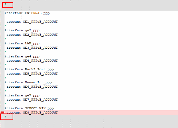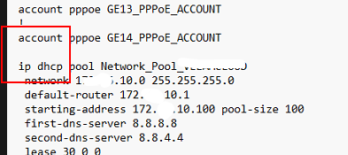 Here, the configure terminal account PPPoE GE14 could not be configured. So what we need to do is to search (ctrl+f) in the config file for the GE14 command that the firewall is trying to execute.