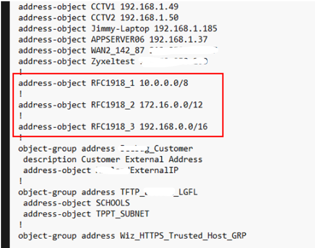 After some trial and error back and forth, we found out that the address objects here was in the wrong place in the config file, and was changed to in-between the address-object and object-group address